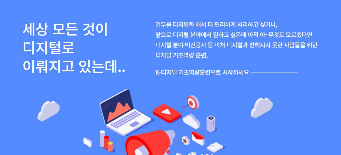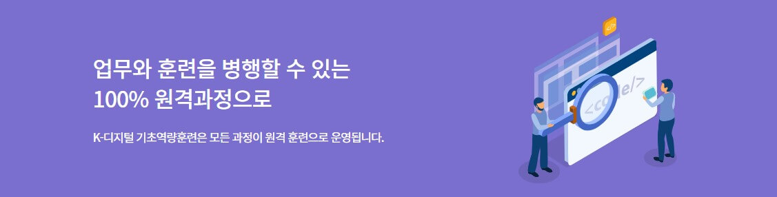 해당 교육은 인터넷으로만 진행되는 원격훈련이므로, 다른 훈련과정과는 달리 '훈련장려금(교통비, 식비)'은 지원되지 않습니다. 지털 신기술들을 'K-디지털 기초역량훈련'을 활용하여 쉽게 습득하실 수 있습니다.