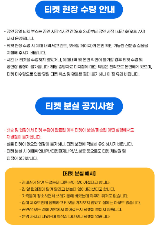 표는 잃어버리거나, 손상되거나, 도난당한 경우에는 다시 발행되지 않으며, 표가 없으면 입장하실 수 없으므로 반드시 표를 소지하시기 바랍니다. 보관에 신경 써 주세요. 예약 대기 및 같은 좌석 재예매 서비스는 지원하지 않습니다.