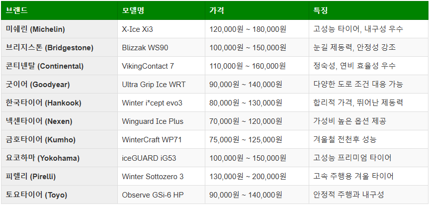 - 합리적인 가격대를 원한다면 한국타이어, 넥센타이어, 금호타이어 등의 국내 브랜드를 고려하세요.
