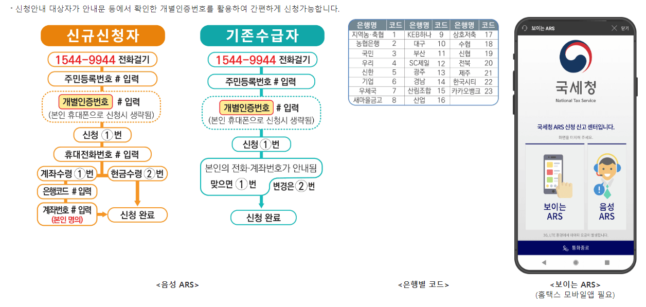 신청정보 대상자는 국세청 홈택스(www.hometax.go.kr )에서 로그인 또는 개별 인증번호로 간편하게 신청할 수 있습니다.