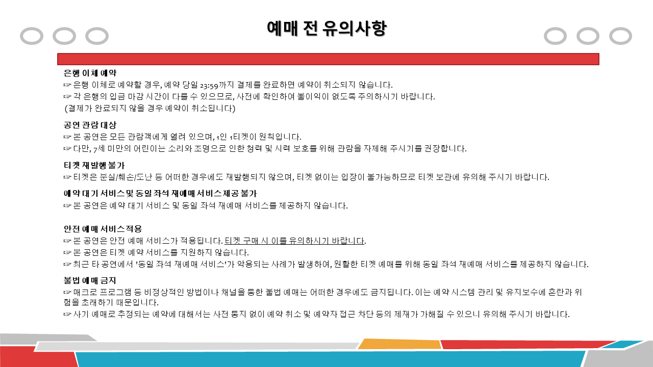 본 공연은 안전 예매 서비스가 적용되며 티켓 예약 서비스를 지원하지 않습니다.