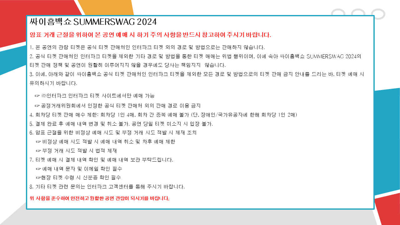 "<씨제이이앤엠 SUMMERSWAG 2024>를 찾아주시는 모든 관람객들의 안전한 관람을 위해 현장 운영에 박차를 가하며 철저한 준비를 해왔습니다. 안전하고 즐거운 관람을 위해 공연 중 좌석에서의 무리한 이동과 과도한 행동을 자제해 주시길 바라며, 무대에 가까이 시야가 가려질 수 있습니다. 다소 불편하실지라도 타인의 안전을 위해 조심해 협조해 주시기를 부탁드립니다."